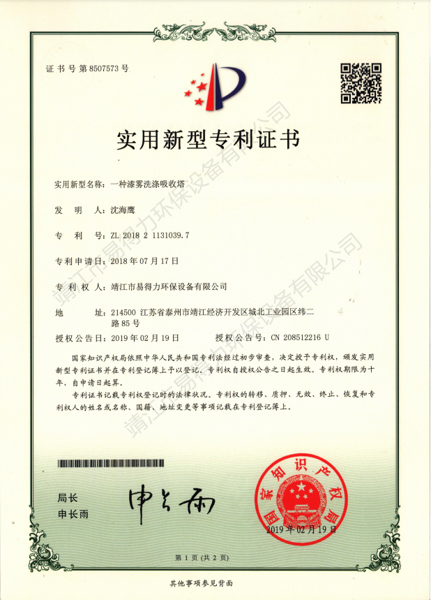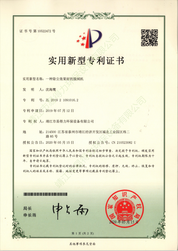 專利證書本公司坐落于開放開發(fā)超前城市江蘇靖江,我們精良優(yōu)秀設計團隊始終遵循著創(chuàng)新超越的理念,贏得了中外合資企業(yè)的信賴。易得力環(huán)保設備有限公司與上海環(huán)科院等科研單位保持合作關(guān)系,不斷加大自身的科研力量,集中了一批國內(nèi)環(huán)境科技研究和應用方面的高素質(zhì)人才,取得多項實用新型專利證書。…… 查看更多 >>